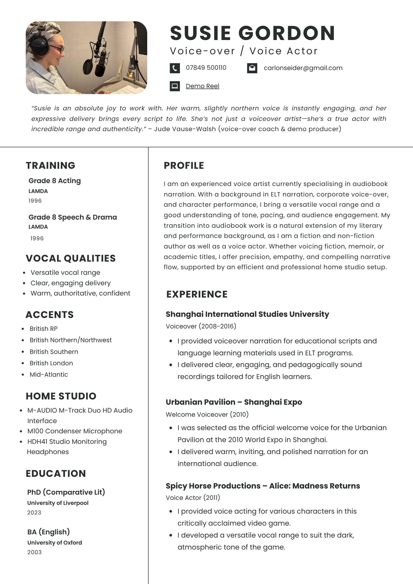 voice acting My sample reel can be found here. Share this: Click to share on Facebook (Opens in new window) Facebook Click to share on X (Opens in new window) X Like Loading... Related